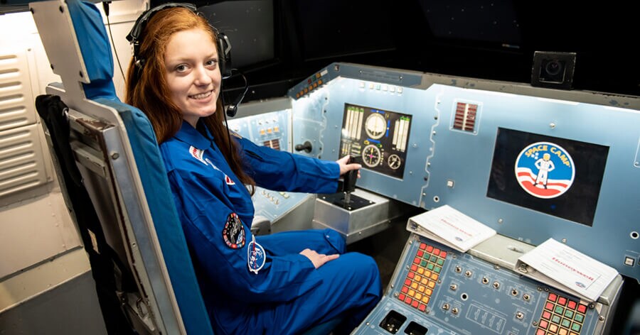 The week’s activities are focused on aviation, space, and rocketry. Students built and launched model rockets with sensor payloads, guided teammates through a simulated space shuttle mission, and took a ride in a Multi-Axis Trainer like those used by Mercury program pilots in the 1950s and 1960s.