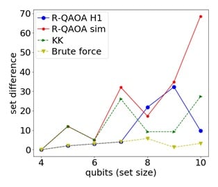Figure 1: Experimental data taken on the Honeywell System Model H1 demonstrating the performance of the R-QAOA vs. the classical KK heuristic, and the brute force answer (smaller set difference is better). For both H1 (blue) and the simulator (red), 200 shots were taken.