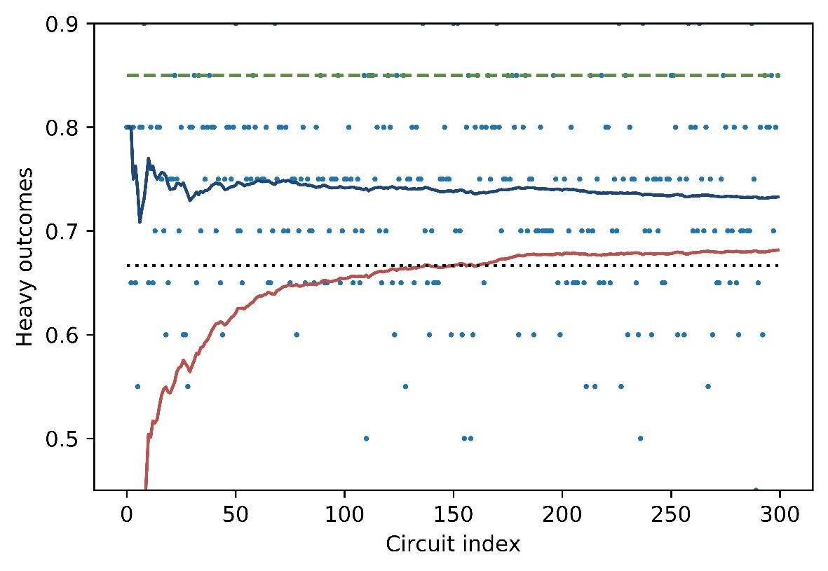 The plot above shows the individual heavy outcomes for each Quantum Volume 512 run. The blue line is an average of heavy outcomes and the red line is the lower 2-sigma error bar which crosses the 2/3 threshold after 151 circuits.