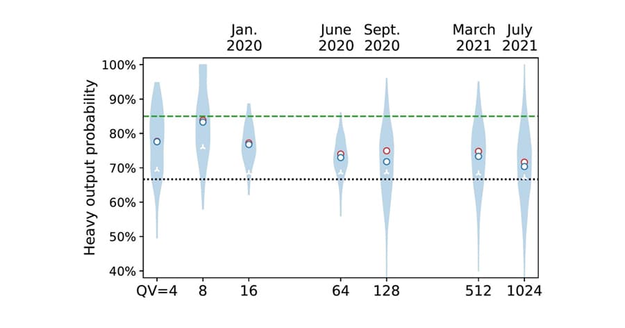 The plot above shows the heavy outputs for Honeywell Quantum Solutions’ tests of quantum volume and the dates when each test passed. All tests are above the 2/3 threshold to pass the respective Quantum Volume benchmark. Circles indicate heavy outcome averages and the violin plots show the histogram distributions. Data colored in blue show system performance results and red points correspond to modeled, noise-included simulation data. White markers are the lower 2-sigma error bounds.